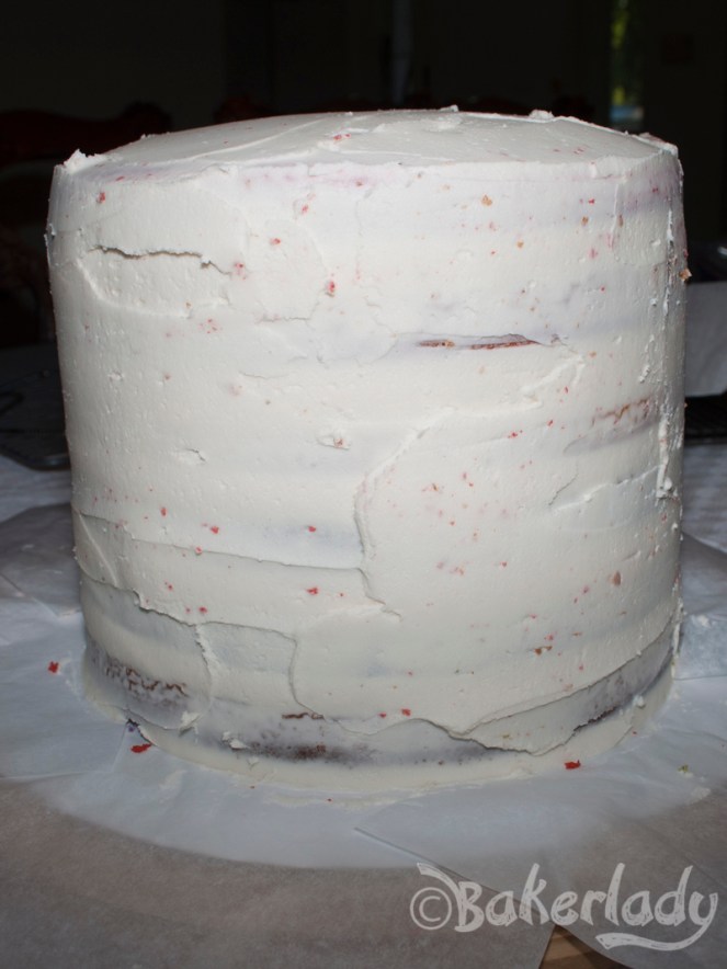 Now we’re going to do a crumb coat to lock in all the little bugger flecks of multi-colored cake bits. Slap frosting on there. All over all the layers. Don’t worry about making it perfect. We’re going to go over the top of it. This is the ugly layer. It looks like my cake has a bad case of chicken-pox.