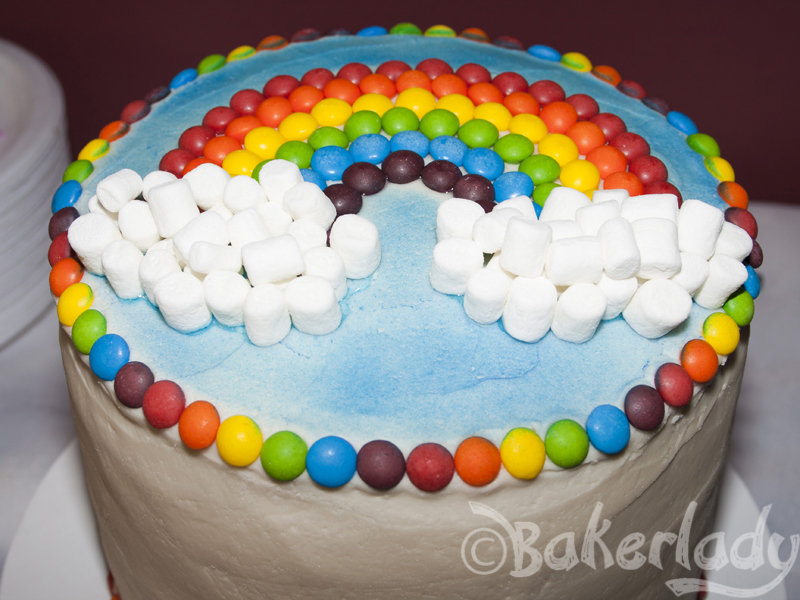 I decorated the exterior of my cake with a layer of Skittles (and blue M&Ms) around the top and bottom. Then a rainbow on top with puffy marshmallow clouds. I used clear piping gel to stick the marshmallows on. I printed off a rainbow coloring page and traced the outline of the rainbow with the piping gel, then set it lightly on the top of the cake, transfering the outline so I could make a perfectly arched rainbow by following the lines. Yes…I cheated. And you can too. There are people who can do amazing things like cut in a straight line and place perfectly arched rainbows freehand. I am not one of those people. I buy the wrapping paper with the grid lines on the back, and I’m not ashamed of it.