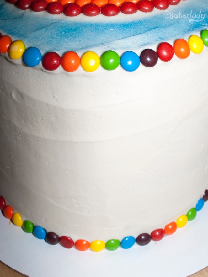My sisters were over to help with the decorating (because I’m craft challenged) and they helped me put the finishing touches on this cake. We didn’t have the idea to airbrush some sky blue on until AFTER we’d placed all the Skittles. You can save yourself a lot of trouble by doing this step first. Using the airbrush color cans you can get at any grocery store, spray the top of the cake a light blue. Use a pie crust cover to block the color from ending up all over the sides of the cake.