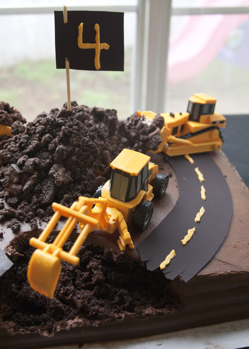 First, I got my friendly local grocery store to whip together a plain chocolate sheet cake with chocolate frosting. No borders, no rosettes, no nothing. Just plain chocolate frosted. And, ordered a container of chocolate frosting to go with it. I had a five pack of construction vehicles all ready to go at home as well as some sugar paper for the road. You could do the road with fondant, but that would have required me to make fondant – which I didn’t have time for. I traced two curved pieces of the road using some of my boy’s Thomas Train tracks as a guide, cut the ends ragged, then plopped them on each side of the cake. I carved out a hole with a fork and dumped the pile of frosting at the back where the two pieces of road didn’t really match up (a genius way to cover my shoddy work…if I do say so myself). Then I crumbled up some Oreos and spread them on top of the pile of frosting to look like dirt.