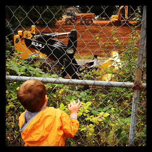 The vacant lot next door to my son’s preschool has been under construction since the summer and he’s obsessed with what he calls tractors. I call them CAT’s. What do you call the big yellow construction equipment? Whatever you name it, my son adores it. During my daughter’s VBS in August, we stood at the chain link fence for an hour every day just watching the construction site. We saw holes being dug, a giant pile of dirt (I mean HUUUUUGE), a “tractor” push down a 70 foot tall tree and all kinds of comings and goings. The Donosaur loved it. For those of you wondering…yes, he’s wearing a rain jacket in this picture. Yes, it was taken in August. I live in Seattle. It’s how we roll.
