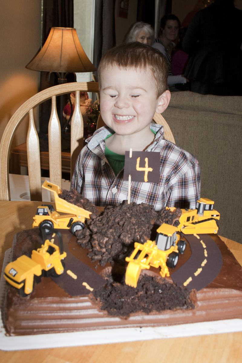 With the daily dose of construction, Donovan decided he absolutely HAD to do a “tractor” birthday party. So I set about to create the perfect cake for him. This is not it. No, the perfect cake would have been much more elaborate. However, the day I’d set aside to create this masterpiece of a cake was hijacked by my mortgage lender. Who, after 6 months decided to finally finish up our refinance and require me to run all over town getting cashiers checks, signatures and faxes. I had to improvise and throw together this cake, which took almost no time at all, but looked pretty cool regardless. I then spent his entire birthday beating myself up about how I didn’t make it from scratch. I know. I’m a sick person. I’m working on it. The point is, absolutely anyone can make this cake. It takes virtually zero skill.