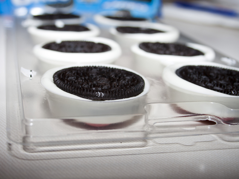 Then, press an Oreo into the well until it is flush with the top of the candy mold.