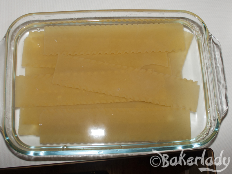 Don’t be afraid of this recipe. It’s a lot of steps, but not hard at all. It easily makes two 9×9 casserole dishes or one large 13×9 dish. First up, the noodles. I’m not a fan of boiling noodles. I’ve just never found them to be particularly easy to work with once they’re completely cooked in boiling water. So, I put my lasagna noodles in a pan and pour boiling water over them (I just use my electric tea kettle). Let them sit for 30 minutes. Which is perfect for just about any lasagna recipe. Because it takes that long to get everything else together.