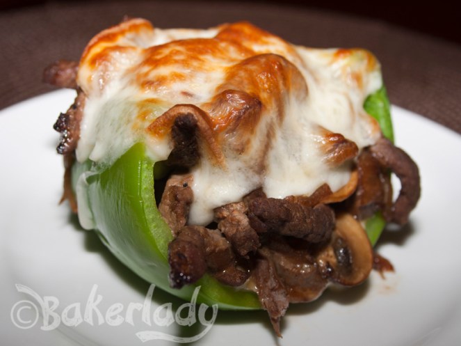 Perfectly succulent strips of steak swimming together with sweet caramelized onions and rich sautéed mushrooms all stuffed into a gorgeous pepper sandwiched between two gloriously melted pieces of provolone. (food happiness sigh) Look at me from the side. Does this delightfully dripping cheese make me look fat?