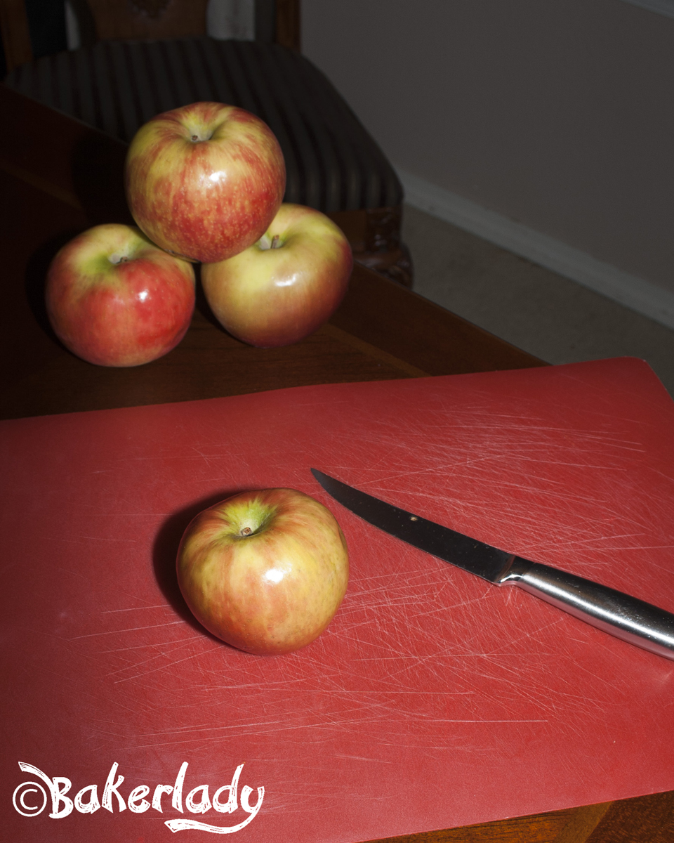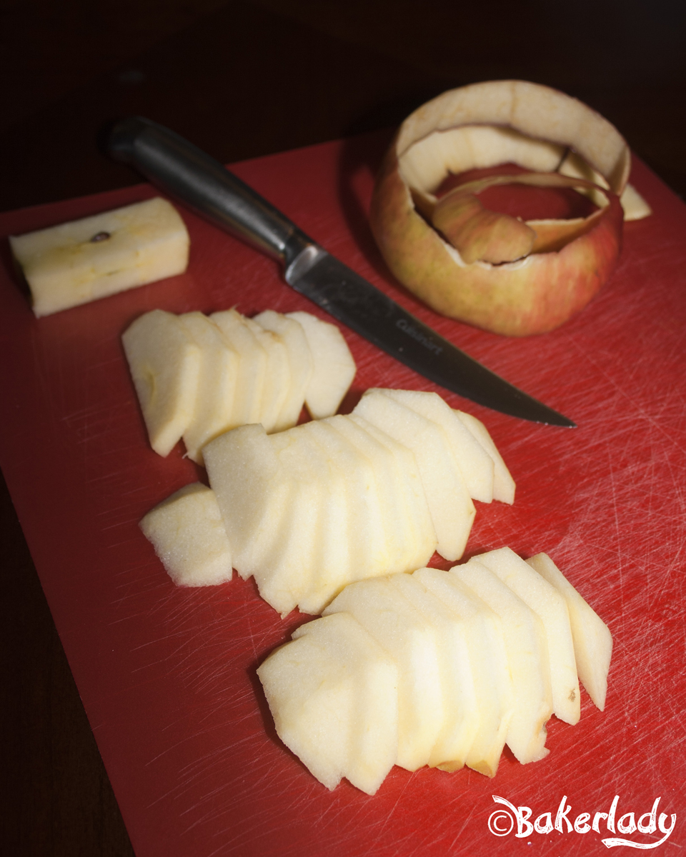First a little how-to regarding cutting apples for pie. If you have an apple-peeler-corer-slicer, feel free to use it..if you can. I find that many honeycrisps are just way too big for mine and I end up with half an apple thru and then get stuck. It’s very frustrating. It’s much easier to just cut them by hand. With this method anyway. First get a cutting board and a knife. It doesn’t even have to be a fancy paring knife. Here’s my set up with one of my steak knives.