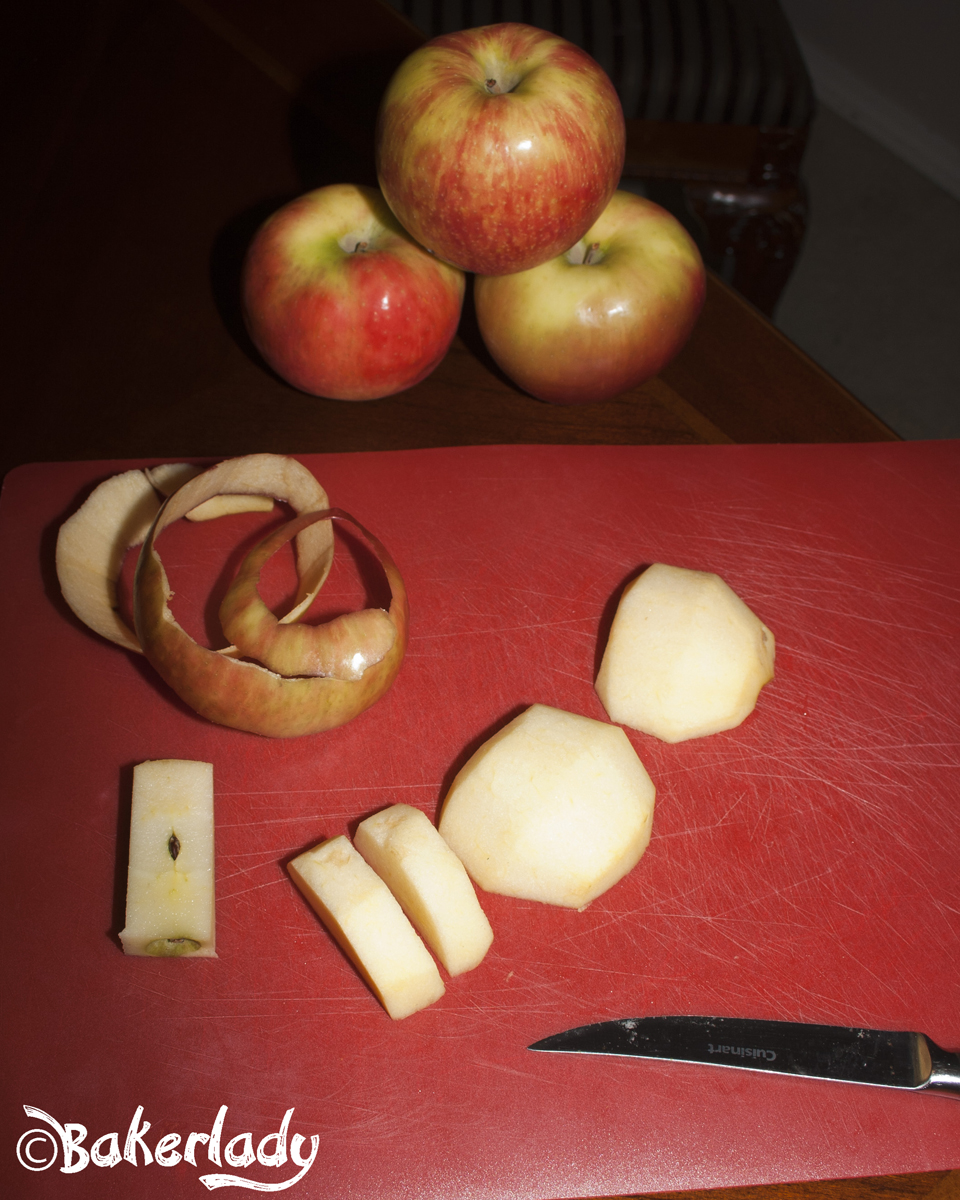Peel the apple. My goal here is always to get the one long curl like in Sleepless in Seattle. My kids love watching me peel apples and seeing the twisting, twirling outter layer come off all together.