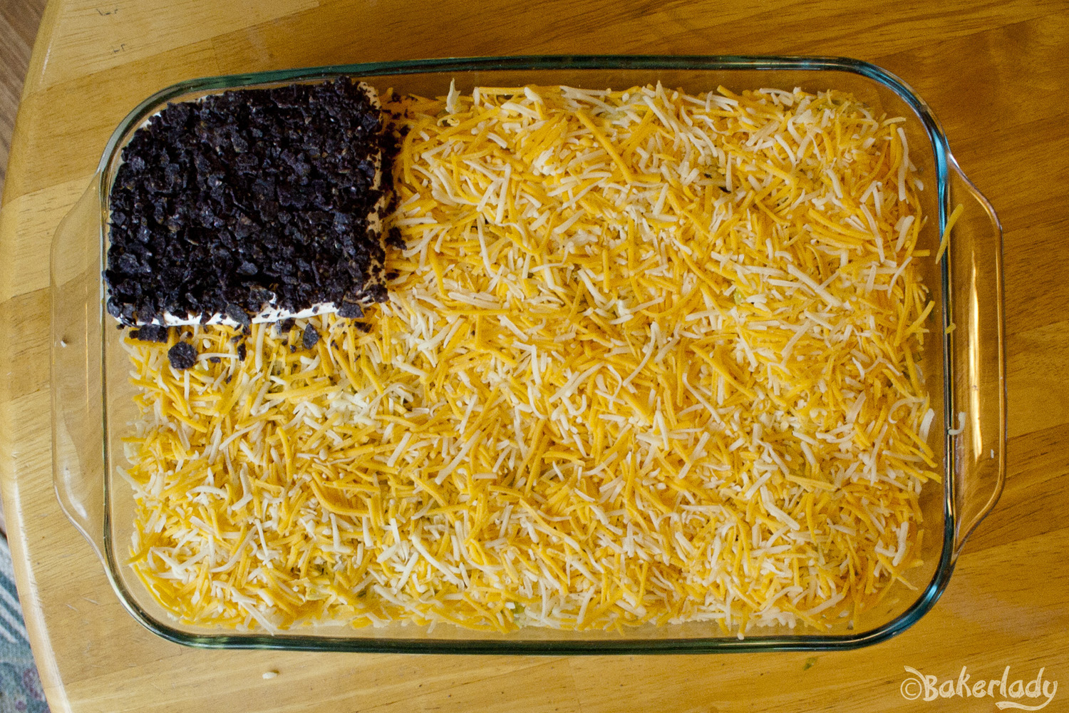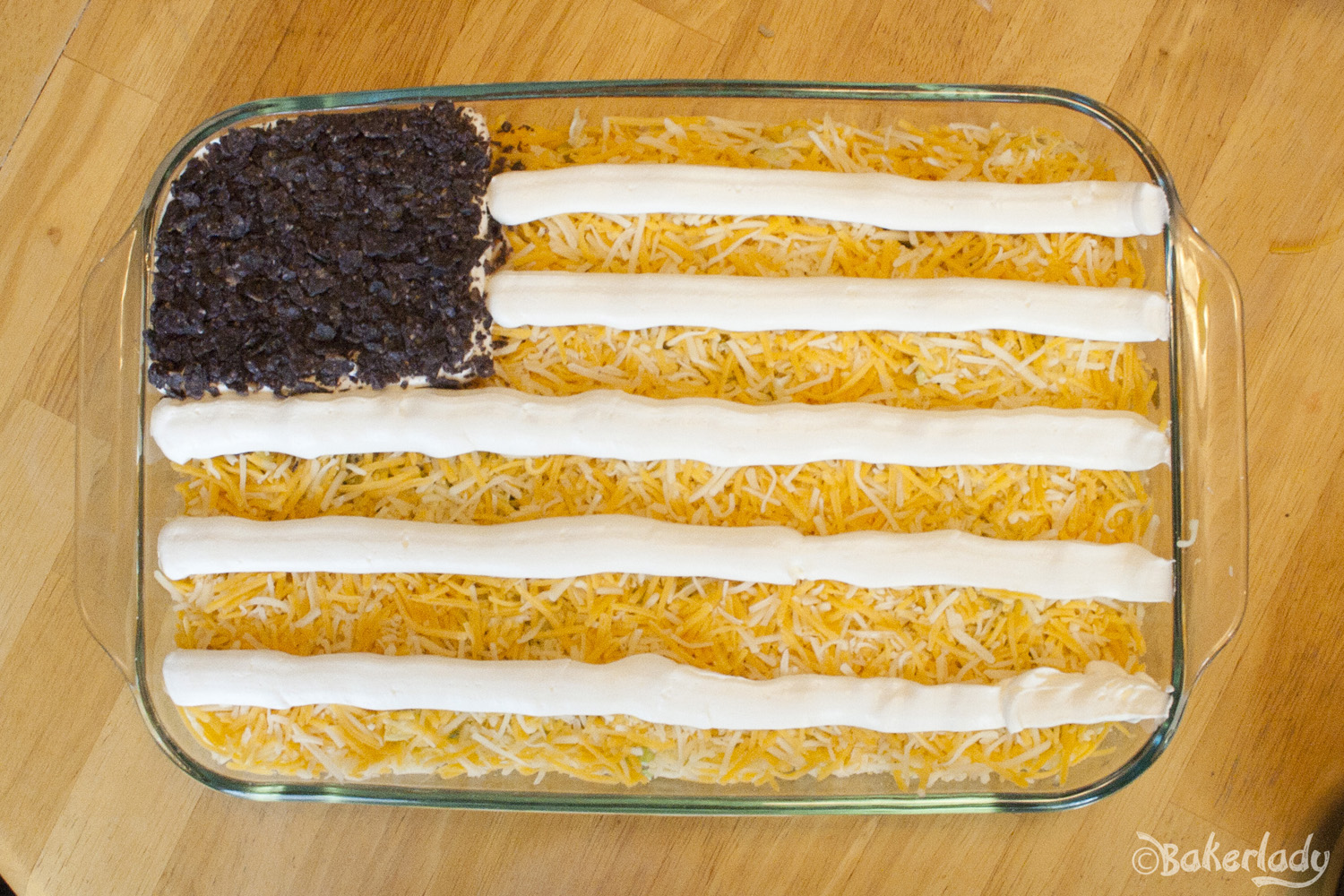 Now crush up your favorite blue corn chips and sprinkle on top. You want to do this now so it doesn’t matter as much if it’s a little messy. We’ll cover it up in the next steps. My “blue” was bordering on black-ish. I hear there are great blue ones at World Market, but I couldn’t find them when I made this last year. Maybe I’ll be luckier this 4th.