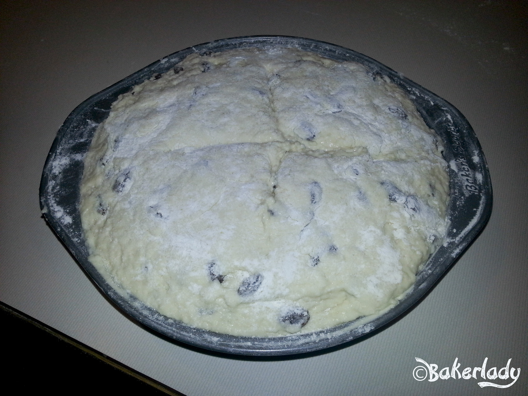 *In a mixing bowl, combine flour (reserving 1 tablespoon), sugar, baking powder, baking soda, and salt. In a small bowl, blend eggs, buttermilk and sour cream. Stir the liquid mixture into flour mixture just until flour is moistened. Knead dough in bowl about 10 to 12 strokes. Dough will be sticky. Place the dough in the prepared skillet or pan and pat down. Cut a 4×3/4 inch deep slit in the top of the bread. Dust with reserved flour