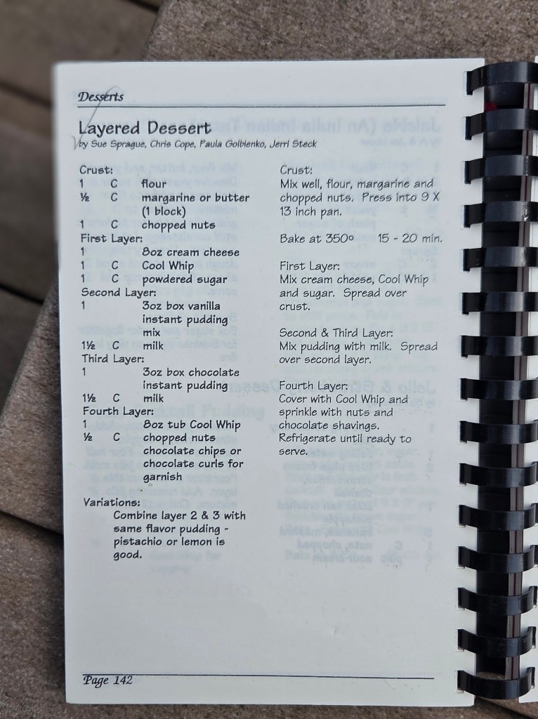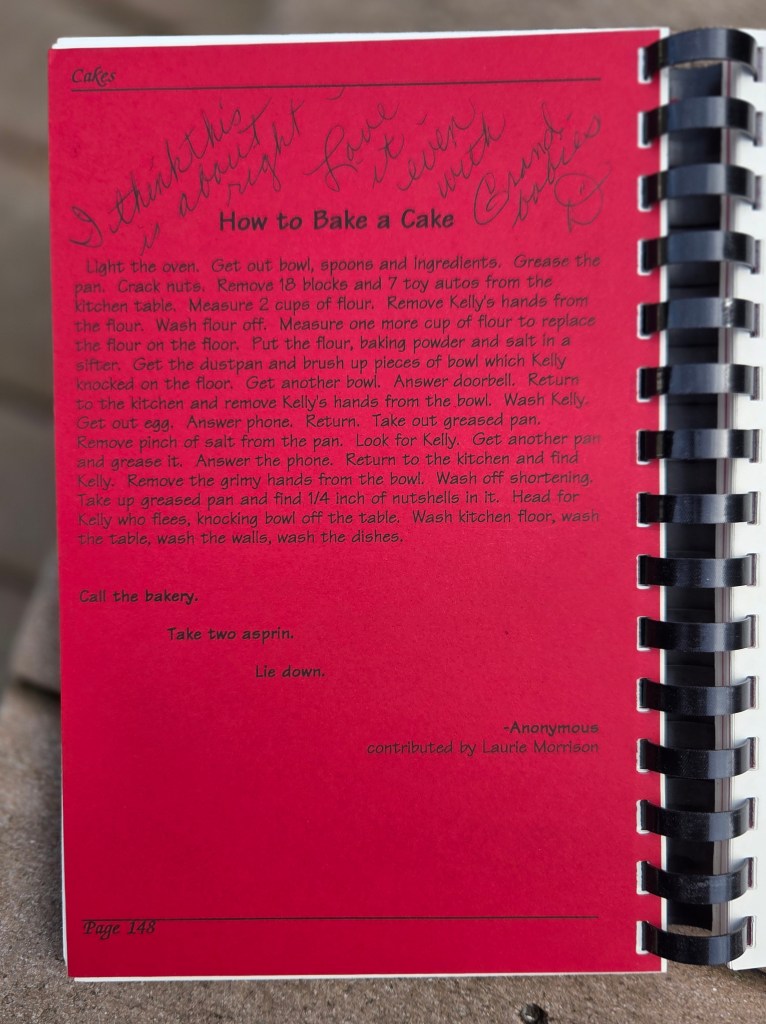 I was just a sprite back then, but I remember the buzz around the sanctuary on Sundays as the cookbook came together. My mother, who donated many recipes, including this one, has a mostly destroyed copy on her shelves. Well loved, food stained, and falling apart at the comb binding. My grandmother gifted me her copy a few years before she went home to be with Jesus, over 30 years old and in pristine condition. Grandma wasn’t that big on baking. Riding motorcycles, meeting up with friends wearing red hats, and being the most straight-forward, loving, generous person I ever knew were more her style. Possibly the only time she ever opened hers was to write this now treasured personal note atop a humorous recipe about baking with children.