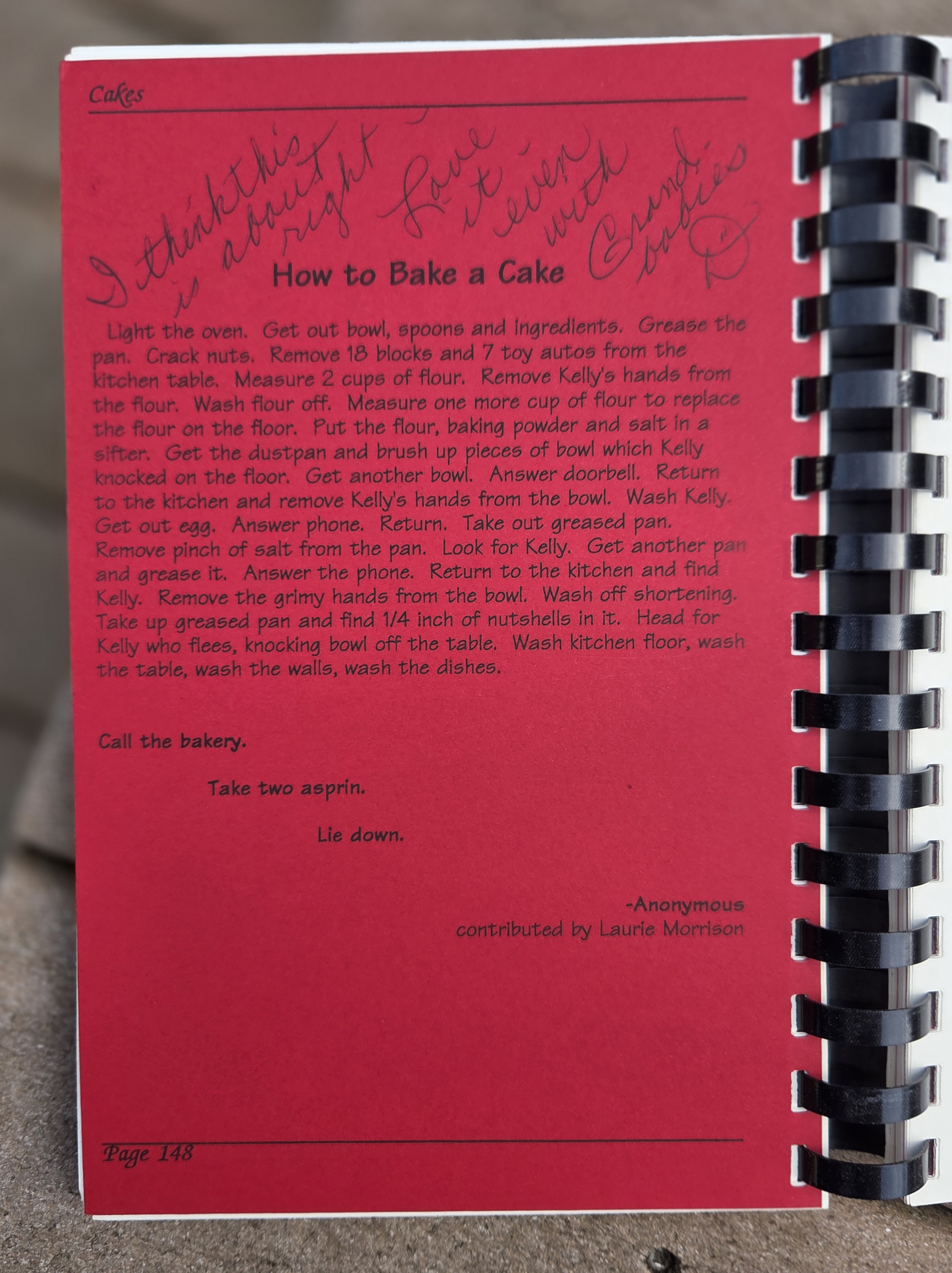 I was just a sprite back then, but I remember the buzz around the sanctuary on Sundays as the cookbook came together. My mother, who donated many recipes, including this one, has a mostly destroyed copy on her shelves. Well loved, food stained, and falling apart at the comb binding. My grandmother gifted me her copy a few years before she went home to be with Jesus, over 30 years old and in pristine condition. Grandma wasn’t that big on baking. Riding motorcycles, meeting up with friends wearing red hats, and being the most straight-forward, loving, generous person I ever knew were more her style. Possibly the only time she ever opened hers was to write this now treasured personal note atop a humorous recipe about baking with children.